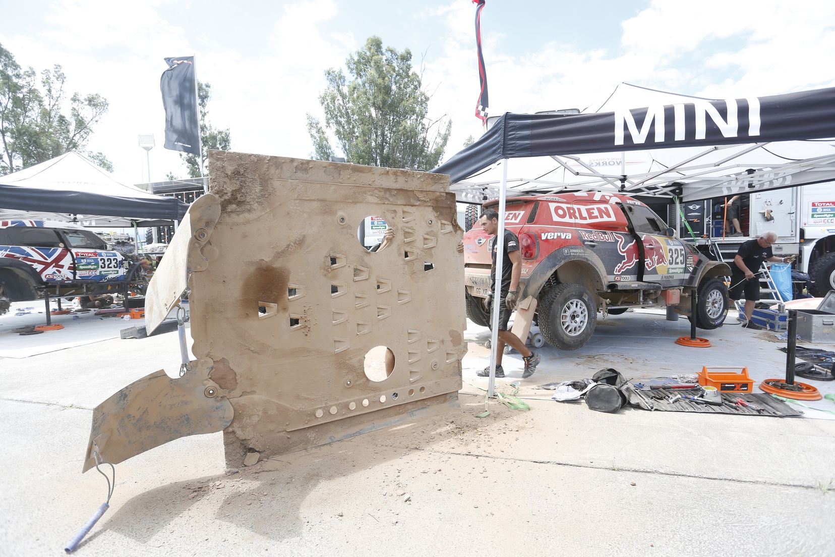 – Jazda z tymi wszystkimi autami i ciężarówkami to była masakra. Wyprzedziliśmy ich w sumie 70. Dwukrotnie się zakopaliśmy. Choć w zasadzie utknęliśmy na prostej drodze, w koleinach po ciężarówkach. Nasze Mini miało za mały prześwit i nie dało się wyjechać z koleiny o głębokości 80 centymetrów. Auto zawisło, wszystkie koła znalazły się w powietrzu i kręciły się. Wydostanie się z tego było męczące i czasochłonne. Podkopywaliśmy, podkładaliśmy trapy i po 30 centymetrów przesuwaliśmy się do przodu. Straciliśmy w ten sposób dwa razy po około pół godziny. Na samym początku, po przejechaniu 45 kilometrów mieliśmy już dwa kapcie. Tak jak wspominałem, koleiny były głębokie i na 80 centymetrów. Nie trudno więc było o to, by wystające z nich kamienie uszkodziły oponę.