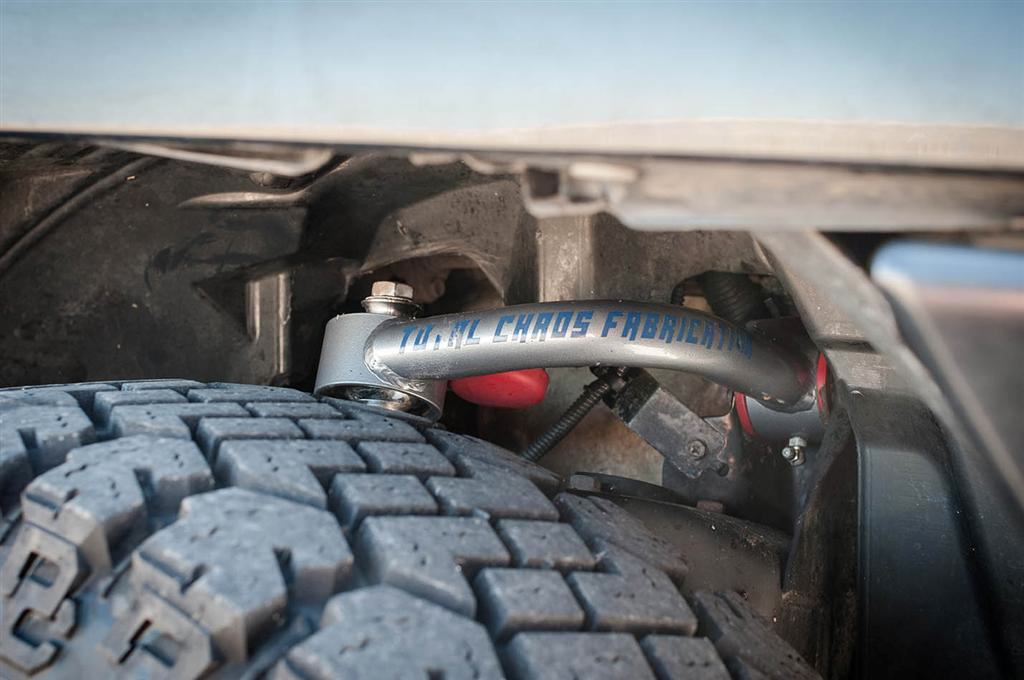 niezależne, podwójne wahacze poprzeczne, sprężyny śrubowe i amortyzatory gazowe Icon Vechicle Dynamics, 2-cale lift, górny wahacz Total Chaos Fabrication o dłuższym skoku, stabilizator