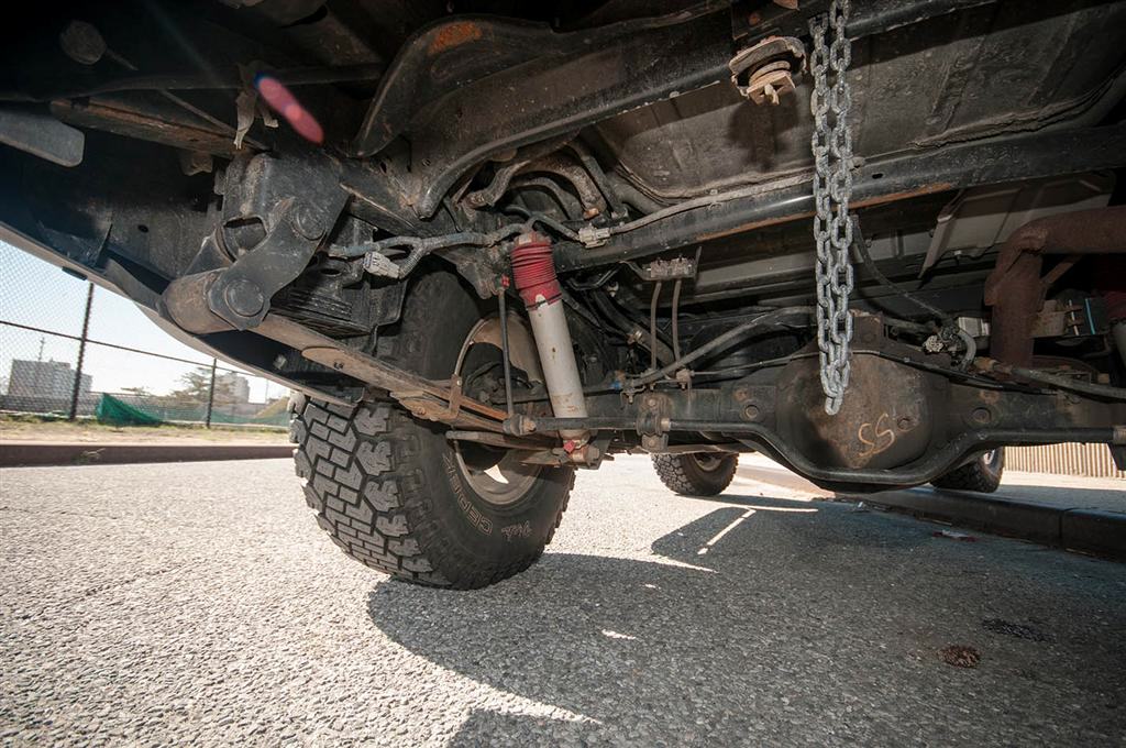 sztywny most Dana44 z elektrycznie sterowaną blokadą mechanizmu różnicowego, resory piórowe, amortyzatory gazowe Rancho RS9000XL, 2-cale lift, stabilizator
