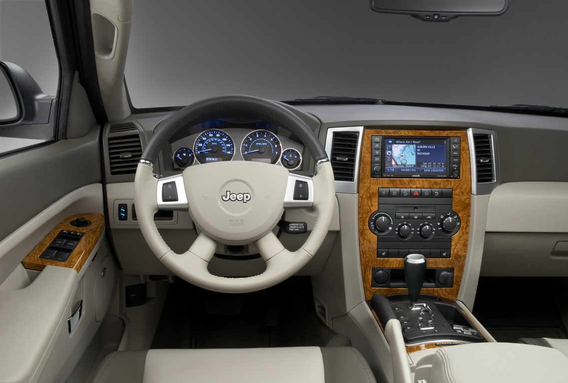 Od początku produkcji narzekano na zastosowanie plastików we wnętrzach pojazdów, a głównie na twarde ich elementy oraz brak finezji. Poprawa przyszła w roku 2008, kiedy to większość tapicerki obszyto skórą, zmieniono kierownicę oraz nieznacznie przestylizowano deską frontową. Zarówno Granda jak i Commandera można spotkać w trzech podstawowych wersjach wyposażeniowych: Laredo (Base/Sport w Ameryce), Limited oraz Overland. Wersja Laredo to najuboższe rozwiązanie, proste radio, twarde plastiki, materiałowe pokrycia foteli- absolutne minimum dla auta użytkowego. Limited natomiast to wersja zdecydowanie godna polecenia, zaopatrzona w skórzane, elektryczne siedzenia, bardzo dobry zestaw audio ze świetnym nagłośnieniem, aluminiowe felgi oraz wiele innych gadżetów. Overland to już najwyższa półka. Wersja ta pojawiła się w sprzedaży dwa lata po uruchomieniu produkcji. Jej główne cechy to zmieniony nieznacznie kształt siedzeń i jeszcze lepsze materiały wykończeniowe wnętrza. W środku wersja cechuje się licznymi drewnianymi wstawkami, zarówno na tapicerce, jak i na kierownicy. Dodatkowo w standardzie jest szyber dach oraz wiele innych „umilaczy” jazdy. Na rynku można też spotkać okolicznościowe wersje, np. rocznicowy model 65th Anniversary Edition. Na koniec nie sposób nie wspomnieć o wersji SRT 8, która występowała tylko w przypadku Granda i miała odmienną stylizację wnętrza, sportowe fotele, kierownicę, itd.
