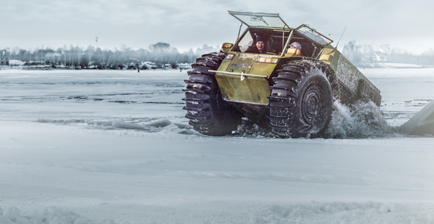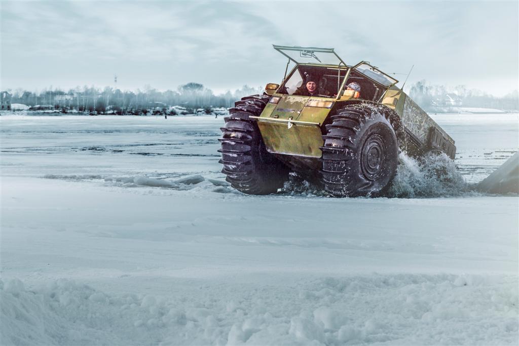 Jak już wspomniałam, Szerp to pojazd, który przejedzie przez każdy teren, nawet ten najbardziej wymagający. 60-centymetrowy prześwit pozwala na pokonywanie niemałych przeszkód, np. kamieni czy pni drzew. Pojazd sprawnie przemierzy ląd i nie zawaha się wjechać na zamarzniętą taflę jeziora, zaspę śnieżną czy błotną drogę. A do tego Szerp z każdej opresji wyjdzie bez szwanku.