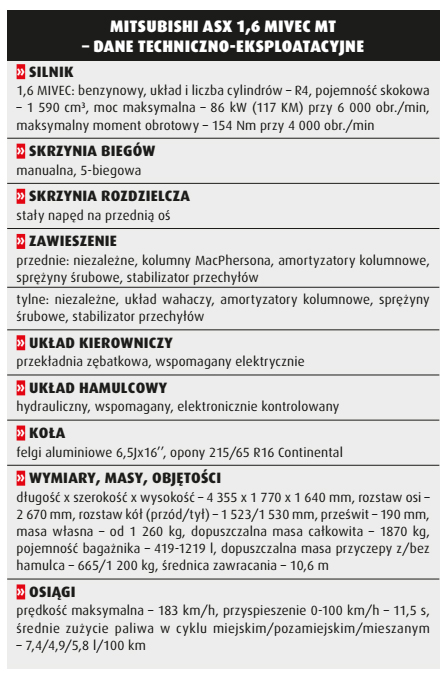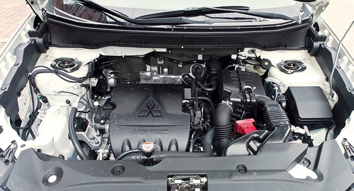 W ofercie Mitsubishi figurują silniki rzędowe: benzynowy o pojemności 1,6 l i o mocy 117 KM oraz dwa diesle (1,6 o mocy 114 KM lub 2,2 o mocy 150 KM). Do testów otrzymaliśmy wariant z najsłabszą jednostką benzynową, która nie powala osiągami. Kierowca musi mocno dociskać pedał gazu i kręcić silnik na obrotach, aby móc sprawnie się poruszać. Dużo lepszym wyborem jest diesel o pojemności 2,2 l, który w tym pojeździe sprawuje się znacznie lepiej.