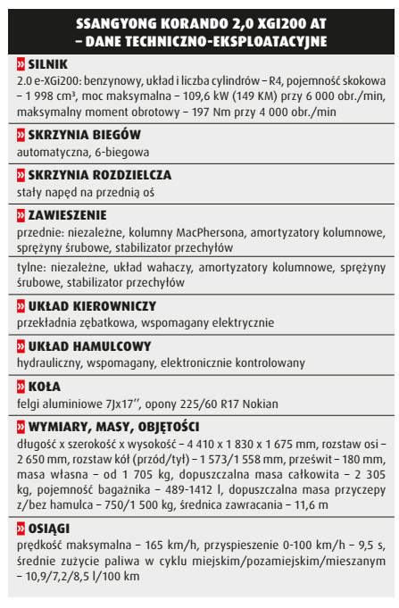 SsangYong Korando jest dostępny z benzynową jednostką o pojemności 2 l i mocy 149 KM oraz z silnikiem wysokoprężnym o pojemności 2,2 i mocy 178 KM – tutaj downsizing jeszcze nie dotarł. W testowym modelu mieliśmy do czynienia z jednostką benzynową sparowaną z automatyczną skrzynią sześciobiegową. Taka konfiguracja pozwalała na sprawne ruszanie, ale nic poza tym. Zdecydowanie lepszym rozwiązaniem byłaby konfiguracja ze skrzynią manualną lub wariant z silnikiem diesla, który dysponuje wyższymi momentami.