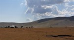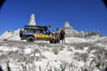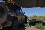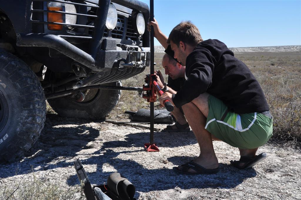 Na jednym ze stepów przeżyliśmy zderzenie z naturą, dosłownie i w przenośni. Po przejechaniu kilku tysięcy kilometrów tranzytem pierwszy raz zjechaliśmy w teren, eksplorując kilkadziesiąt kilometrów prawdziwymi bezdrożami, kierując się na azymut. Wystarczyła chwila nieuwagi i zbytnie zaufanie do płaskiego terenu, by momentalnie wytracić niewielką (całe szczęście) prędkość, trafiając do rowu, przecinającego w poprzek naszą trasę. Żadne z nas nie miało zapiętych pasów. Bagażnik wraz z całą zawartością zawisnął niebezpiecznie nad maską. Warto w tym momencie nadmienić, że to, co się na nim znajdowało ważyło niemało – 90-litrowy zbiornik z wodą, drugie tyle zbiorników z paliwem i koło zapasowe. Moja głowa trafiła w przednią szybę. Efekt – głowa cała, gorzej z szybą. Pojawił się na niej wielki pajączek, który towarzyszył nam przez całą podróż. Co więcej skrzywieniu uległ wahacz oraz drążek kierowniczy, przekrzywiając kierownicę o 90 stopni i zasłaniając zegary. Nie ma się co mazać, a już na pewno nie ma się co poddawać. Otrzepaliśmy się, podreperowaliśmy co się da i ruszyliśmy w dalszą drogę.