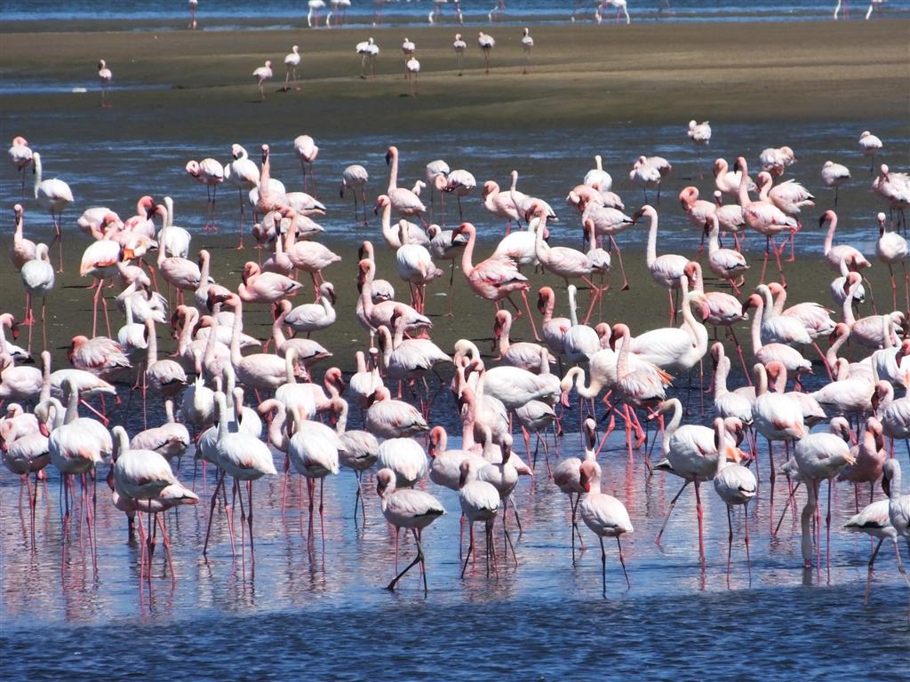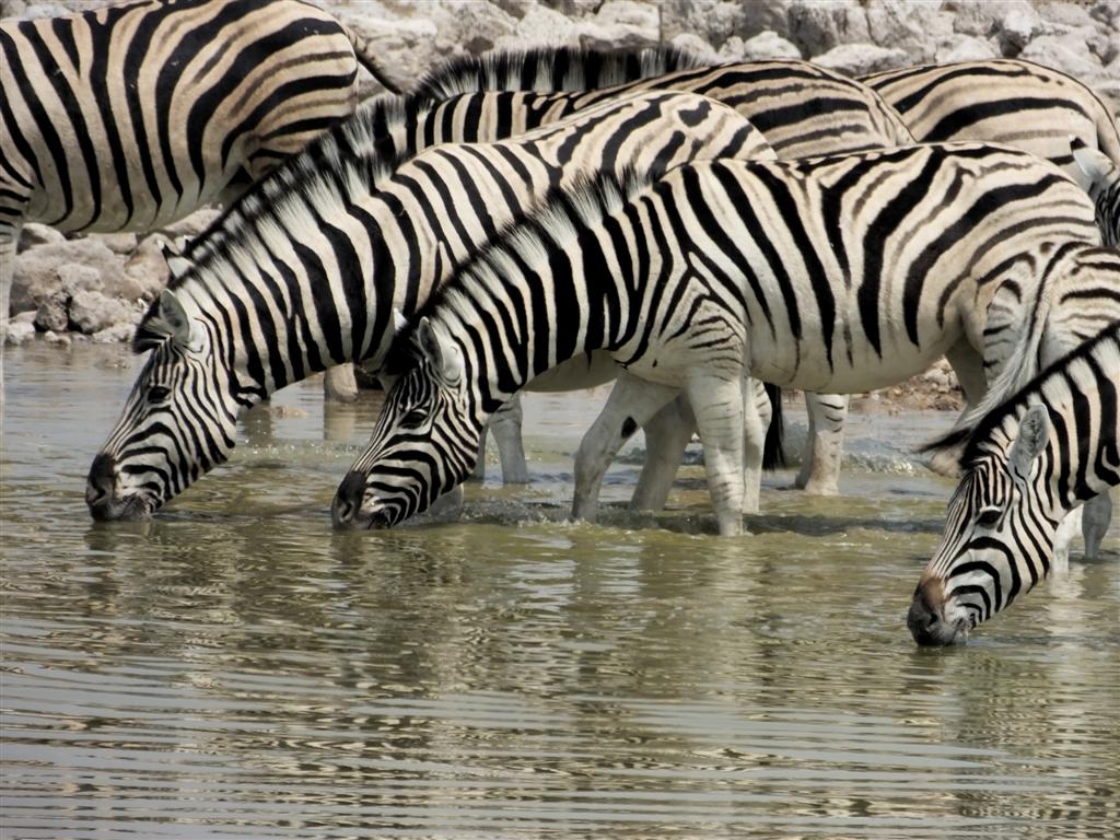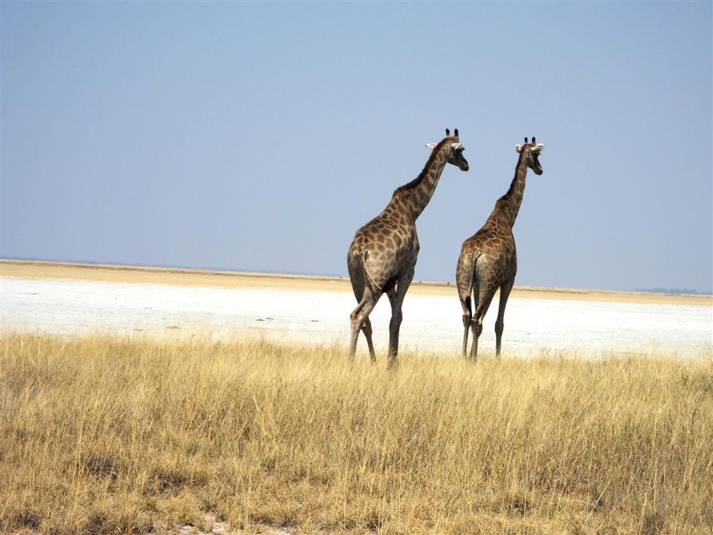Nadszedł wreszcie czas na wizytę w Parku Narodowym Etosha. Ta olbrzymia solna panew, w porze deszczowej częściowo zalana wodą, tworzy tereny koncentracji ptactwa. My odwiedziliśmy Etoshę w porze suchej, kiedy to nieliczne wodopoje są miejscem intensywnej koncentracji zwierzyny. Od świtu niestrudzenie jeździliśmy samochodem po dobrze utrzymanych drogach, cierpliwie ustępując pierwszeństwa wielkim stadom migrującej zwierzyny. Wieczorami natomiast zasiadaliśmy w punktach obserwacyjnych na campingach, gdzie wilgotnymi z emocji rękoma wyrywaliśmy sobie aparat i lornetkę racząc się w międzyczasie południowoafrykańskim winem. Jednego wieczoru w Okaukuejo spektakl przybierał na atrakcyjności z godziny na godzinę. Stada zebr, antylop gnu i oryksów ustępowały miejsca nadchodzącym żyrafom. Naliczyliśmy ich 27 jednocześnie, kiedy to las długich szyj rozpierzchł się, a do wodopoju podeszła samotna lwica. Nie przeszkodziło to jednak w zaspokojeniu pragnienia pokrytemu kurzem i solą ogromnemu samcowi słonia, który ostentacyjnie ignorował wyraźnie speszonego tym faktem kota. Wszystko to działo się kilkadziesiąt metrów od nas, więc tej nocy rozpalone wrażeniami głowy długo nie pozwalały nam zasnąć.