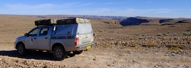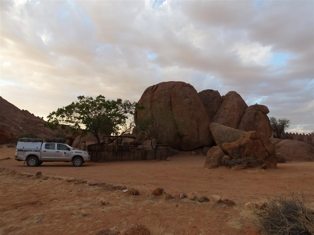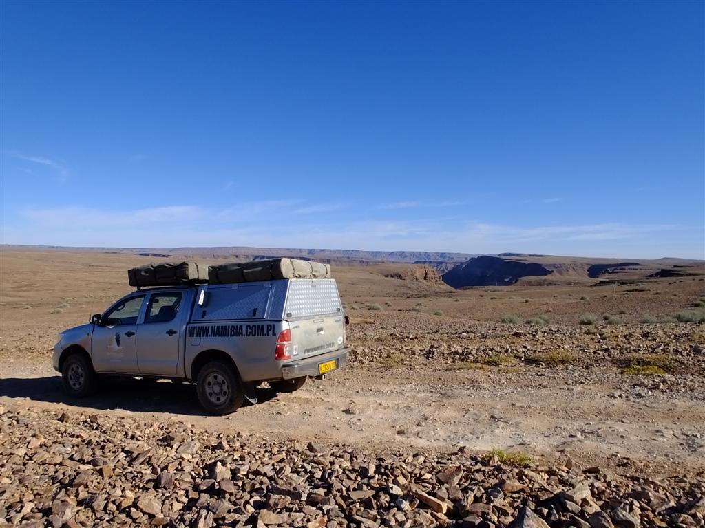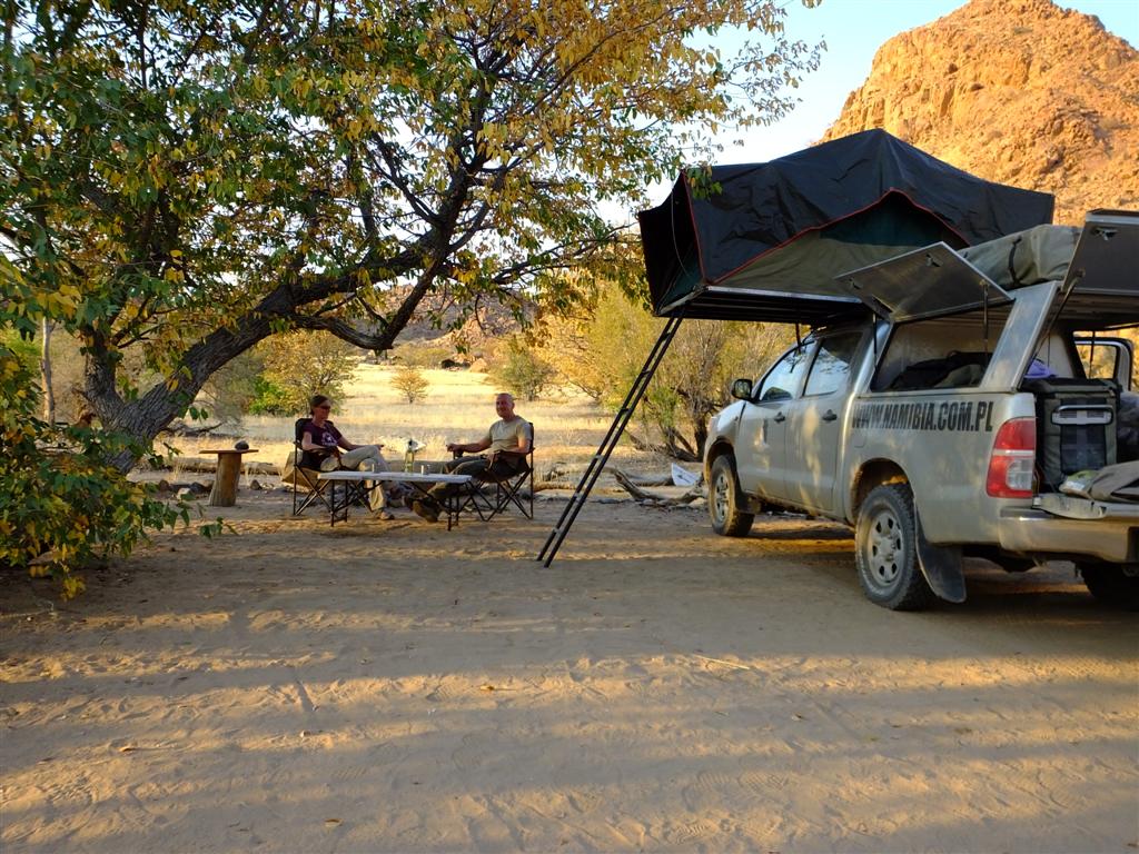 Windhoek przywitało nas chłodnym porankiem i uśmiechniętą twarzą ciemnoskórego pracownika wypożyczalni samochodów dzierżącego tabliczkę z naszymi imionami. Srebrna Toyota Hilux już czekała i po krótkiej demonstracji obsługi jej wyposażenia byliśmy w drodze. Nieco zmęczeni po długim locie i w euforii rozpoczynającej się przygody koncentrowaliśmy się na lewostronnym ruchu i wskazaniach GPS-a. W końcu zaopatrzeni w żywność i wodę opuściliśmy miasto. Wraz z nim skończył się asfalt, a zaczęły się namibijskie szutry i pustynny, księżycowy krajobraz. Pierwszy biwak wypadł gdzieś pośrodku niczego. Po prostu: skromna tabliczka informująca o miejscach campingowych ze strzałką wskazującą kierunek nakłoniła nas do dwudziestokilometrowej jazdy po wyboistej drodze. Po godzinie rozkładaliśmy nasz namiot dachowy i smażyliśmy steki z antylopy, popijając dobre, warzone w niemieckim stylu piwo (nie ma to jak spuścizna po kolonizatorach). Miejsce wydało się nam zupełnie wyjątkowe: kamienny stół, łazienka pod gołym niebem otoczona drewnianą palisadką, miejsce na braai (południowoafrykański grill), ogromna przestrzeń i brak żywego ducha w okolicy. Byliśmy jednocześnie zachwyceni i trochę przestraszeni, ale nie wiedzieliśmy jeszcze, że tak będzie praktycznie codziennie.
