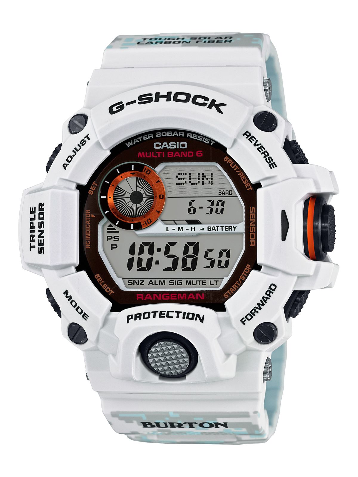 G-SHOCK Rangeman & Burton GW-9400BTJ-8 to model przygotowany tak, aby sprostać surowym i wymagającym warunkom, charakterystycznym dla aktualnej pory roku oraz dla specyfiki sportu jakim jest snowboard. Dlatego też prezentowany zegarek jest wyposażony w system wstrząsoodporny oraz wodoszczelność 200m. Potrójny sensor sprawia, że takie funkcje jak kompas, wysokościomierz, barometr oraz termometr działają bez najmniejszych problemów. Poza tym G-SHOCK Burton posiada wskaźnik wschodu i zachodu słońca, timer, 5 alarmów, stoper, funkcję drzemki, automatyczny kalendarz oraz czas światowy. O dokładność godziny dba wbudowany odbiornik sygnału radiowego, a o nieprzerwany zapas energii podczas zjazdów na stoku panel słoneczny.