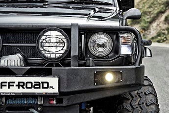 Dogłębnemu zakresowi przeróbek mechanicznych dorównała troska o wyposażenie nadwozia w mniej lub bardziej potrzebny ekwipunek. Z zewnątrz widać oznaki poważnego potraktowania tematu. Rozbudowany blaszano-rurowy przedni zderzak, ze zintegrowaną płytą ochronną spodu silnika, kryje w sobie dobrze chronioną, zdalnie sterowaną wyciągarkę, która choć praktycznie niewidoczna ma na bębnie nawiniętą 30-metrową linę kewlarową. W razie potrzeby kierowca może użyć także tylnej, nieco bardziej wyeksponowanej wyciągarki, dla której znalazło się miejsce pod fabrycznym zderzakiem. Jest na niej 35 metrów liny, także kewlarowej.