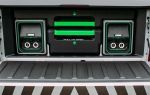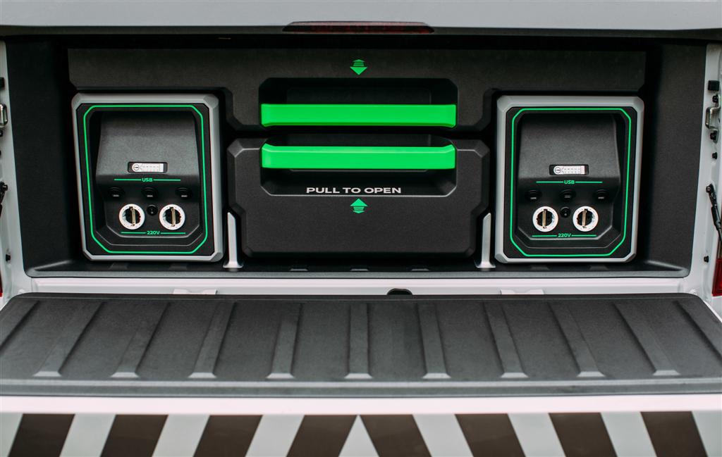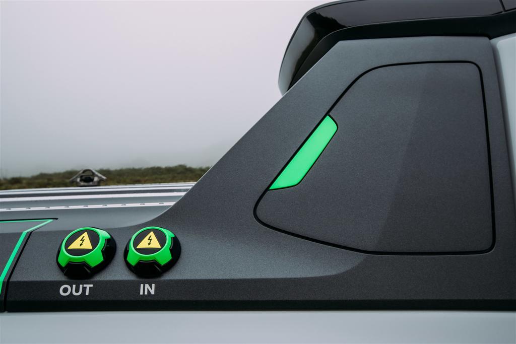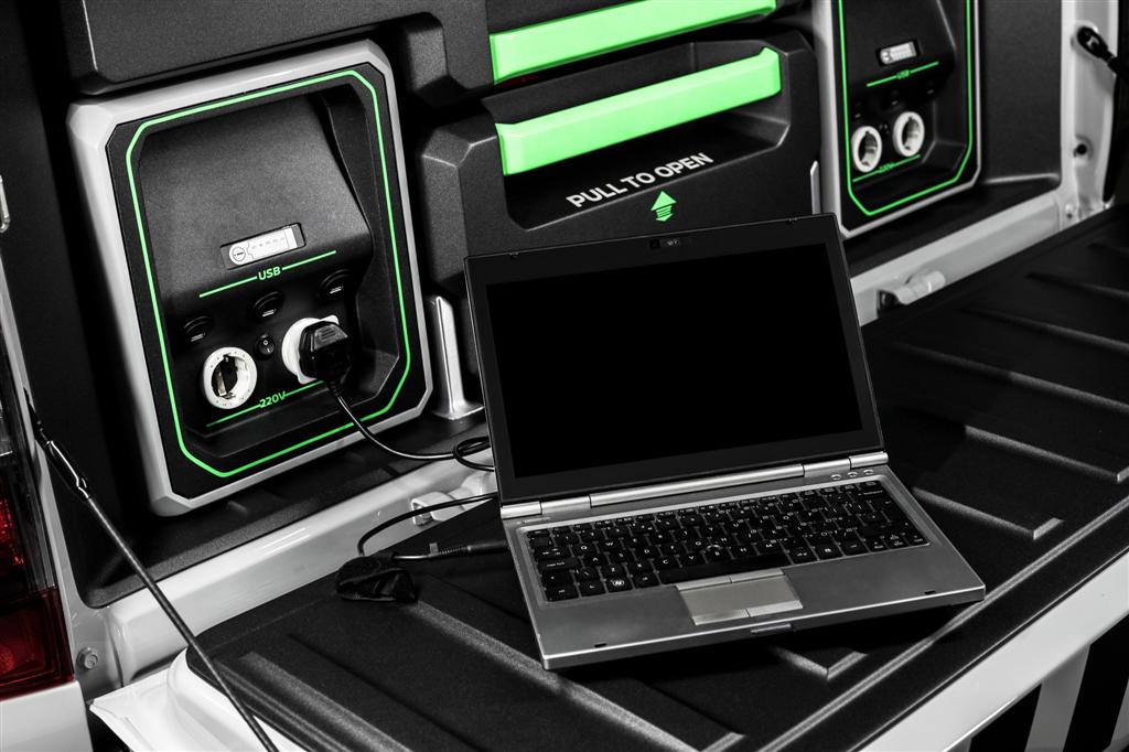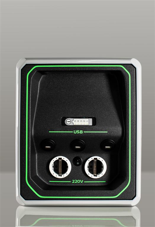Tuż przy wysuwanych schowkach znajdują się gniazda zasilające, po dwa z każdej strony skrzyni ładunkowej. Gniazda są osłonięte indywidualnymi aluminiowymi klapkami. Po każdej stronie pojazdu jest gniazdo wejściowe i wyjściowe, umożliwiające ładowanie zespołu akumulatorowego i pobór energii.