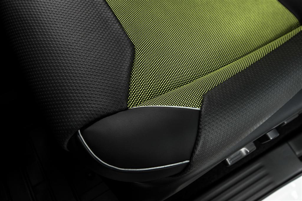 Przeprojektowane fotele mają wytrzymałą tapicerkę z tkaniny SuperFabric z wyraźnym motywem „zbroi”, a białe odblaskowe szwy ułatwiają dostrzeżenie ich konturów w ciemności.