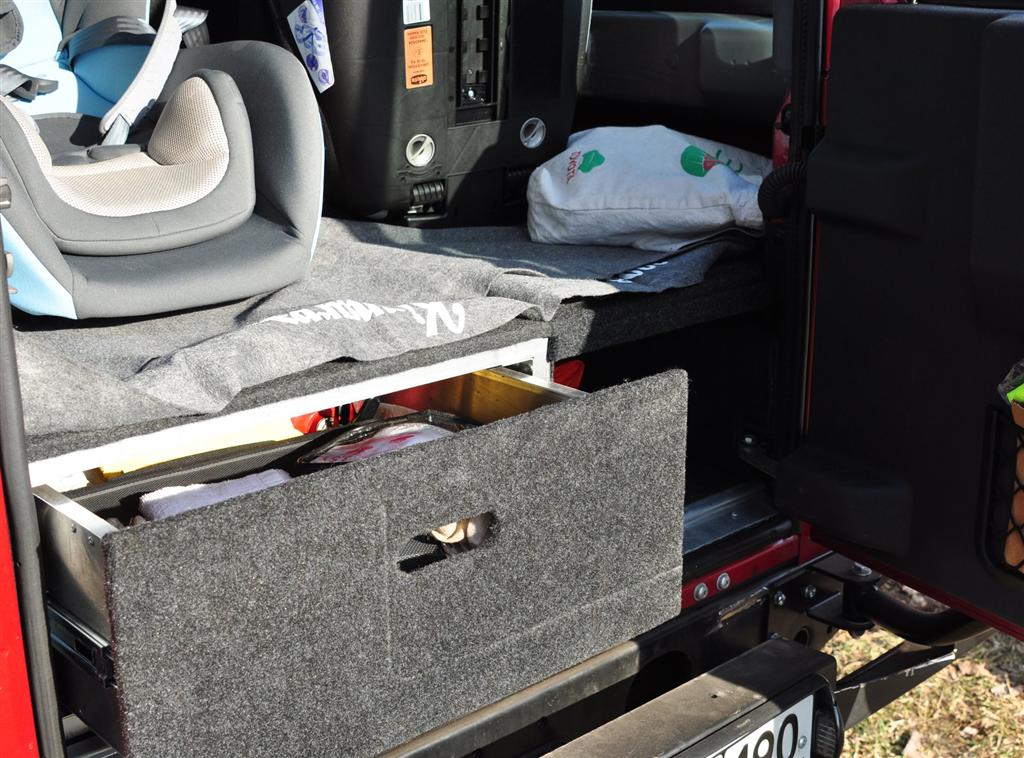Po wygłuszeniu można było zająć się dalszymi przeróbkami wnętrza, a zwłaszcza wykonaniem zabudowy bagażnika. Nie miała ona jednak za zadanie tworzyć miejsca do spania, a jedynie organizować bagaże. Wysokość dobrano tak, by zmieściły się np. narzędzia i zapas oleju. Znalazły one bezpieczne miejsce w jednej szufladzie, a obok pozostawiono wolną przestrzeń na dłuższe ładunki.
