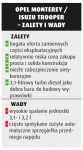 Ograniczony budżet mocno zawęża zasięg poszukiwań używanej terenówki. Jeśli na celowniku mamy w miarę duży samochód, który wprawdzie swoje najlepsze lata ma już za sobą, ale nadal jest atrakcyjny ze względu na prostą konstrukcję i dosyć bogate wyposażenie, oferta Opla i Isuzu jest godna rozważenia. Dodatkowym plusem jest szeroka gama dostępnych wersji nadwoziowych, dzięki czemu możemy dobrać pojazd odpowiedni do naszych potrzeb.