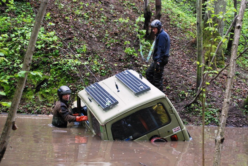 Dojeżdżamy do wąwozu nr 1 i nie wierzymy własnym oczom. Pilot komentuje obraz, który nam się ukazał “To rajd samochodowy, czy spływ kajakowy?” Wiemy skąd wzięło się pytanie o długość linki do karty drogowej. Strumyczek szerokości 1,5 metra to wymiar na wyrost zrobił się miejscami 20 razy szerszy. Ale cóż inni jadą to i my. Okazuje się, że strach ma wielkie oczy. Owszem woda miejscami dochodzi do około 2m głębokości ale dno jest bardzo twarde i fajnie się jedzie choć pod wodą. Po drodze mijamy zatopionych quadów i jakiś samochód, który się zalał. Mijamy odcinek, udało się – z 6 pieczątek zbieramy 4, nie jest źle, zobaczymy co będzie dalej.