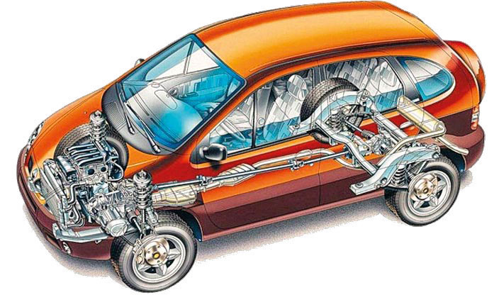 Ponieważ Scenic nie był przystosowany do napędu obu osi, konstruktorzy mieli utrudnione zadanie. Powierzono je więc specjalistom w tej dziedzinie – austriackiej firmie Steyr Daimler Puch, która przygotowywała mocno zmienione względem standardu, czteronapędowe wersje m.in. Fiata Panda 4×4 i Transportera T3 Syncro. Pod płytą podłogową, która nie mogła być zmieniona, musiały znaleźć się elementy napędu tylnej osi. Wał napędowy ulokowano w miejscu wydechu, ale i tak brakło przestrzeni dla nowego zawieszenia. Zamiast tradycyjnej dla francuzów tamtego czasu belki z wahaczami wleczonymi i drążkami skrętnymi użyto wahaczy wleczonych i sprężyn śrubowych. Zamocowano je wraz z tylną przekładnią do ramy pomocniczej. Przekładnia odbierała napęd od wału za pośrednictwem sprzęgła lepkościowego.