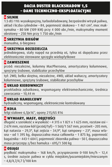 Koncepcyjna wersja Dacii Duster po raz pierwszy pojawiła się w Europie podczas salonu w Genewie wiosną 2009 roku. Rok później zaprezentowano model produkcyjny, a w 2013 przeprowadzono lifting, który ograniczył się głównie do modernizacji kabiny. Testowany przez nas egzemplarz to wariant Blackshadow, charakteryzujący się ciemnym wnętrzem oraz czarnymi elementami na nadwoziu (zderzaki, wykończenia listew). Taka stylizacja ma chyba nieco odświeżać wizerunek Dustera i pokazać, że Dacia podąża za modą, a tym samym jest w stanie sprostać oczekiwaniom klientów.
