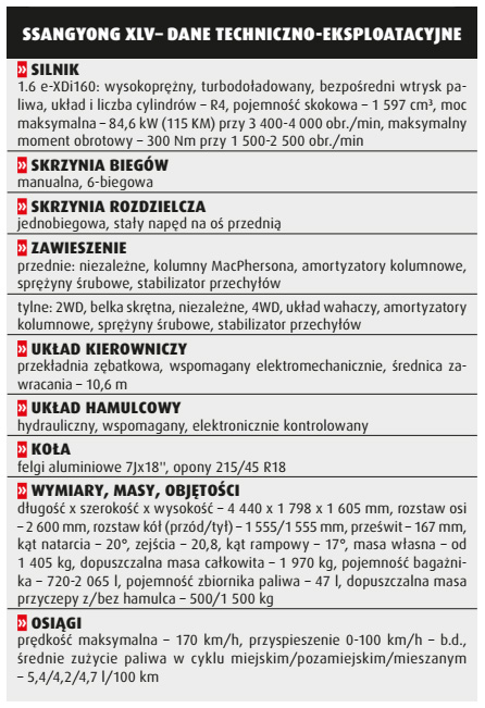Po ostatnim liftingu wnętrze Dacii Duster znacznie się zmieniło. I to na plus. Użyto bowiem materiałów lepszej jakości i popracowano nad ergonomią, przez co kabina pojazdu nie odbiega od tego, co proponują nam auta klasy średniej. Rażą – co prawda – przełączniki zestawu audio, wykończenie tapicerki, włączniki oświetlenia i samo oświetlenie, ale przecież auta Dacii muszą wyróżniać się od tych oferowanych przez Renault. Zupełnie inaczej wygląda wnętrze SsangYonga. Jest ono bowiem bardzo zachowawcze. Odnosimy wręcz wrażenie, że przyjęto stylizację niemiecką, na co wskazują – między innymi – proste i przejrzyste prze- łączniki pozbawione zbędnych udziwnień i zupełnie niekojarzące się z azjatyckim samochodem. Wydłużone nadwozie modelu XLV pozwala załadować więcej bagaży. Również pasażerowie SsangYonga mają zdecydowanie więcej miejsca niż ci podróżujący Dusterem. W kwestii przestronności i projektu wnętrza XLV wypada zdecydowanie korzystniej.