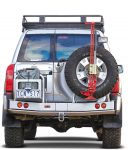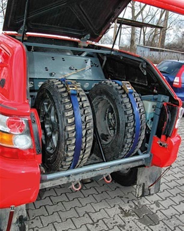 Widok koła zapasowego w tylnej części nadwozia jest tak charakterystyczny, że stał się wręcz wyróżnikiem aut terenowych. Korzystają z tego producenci chcący udowodnić off-roadowy potencjał, choćby w taki sposób. Nieprzypadkowo jednak większość twardych terenówek ma zapas właśnie w tym miejscu – zalet takiego rozwiązania jest sporo. Przede wszystkim sprzęt jest łatwo dostępny. Odpadają też kłopoty z szukaniem miejsca w ramie, między jej podłużnicami, albo w nadwoziu, z tyłu lub boku bagażnika. Ilość miejsca na burcie pozwala w miarę swobodnie zwiększać rozmiary koła. Wiąże się to jednak z pewnymi ograniczeniami. Poza ilością dostępnej przestrzeni, wyznaczonej głównie bliskością zderzaka, nie mniej istotna nośność punktów mocowania. Nie chodzi przy tym o wytrzymałość samego zawiesia, lecz o to, czy wytrzyma element, do którego jest ono mocowane. Najczęściej znajduje się ono na drzwiach otwieranych na bok. Przy klapie otwieranej w pionie musi być już użyte odchylane ramię.