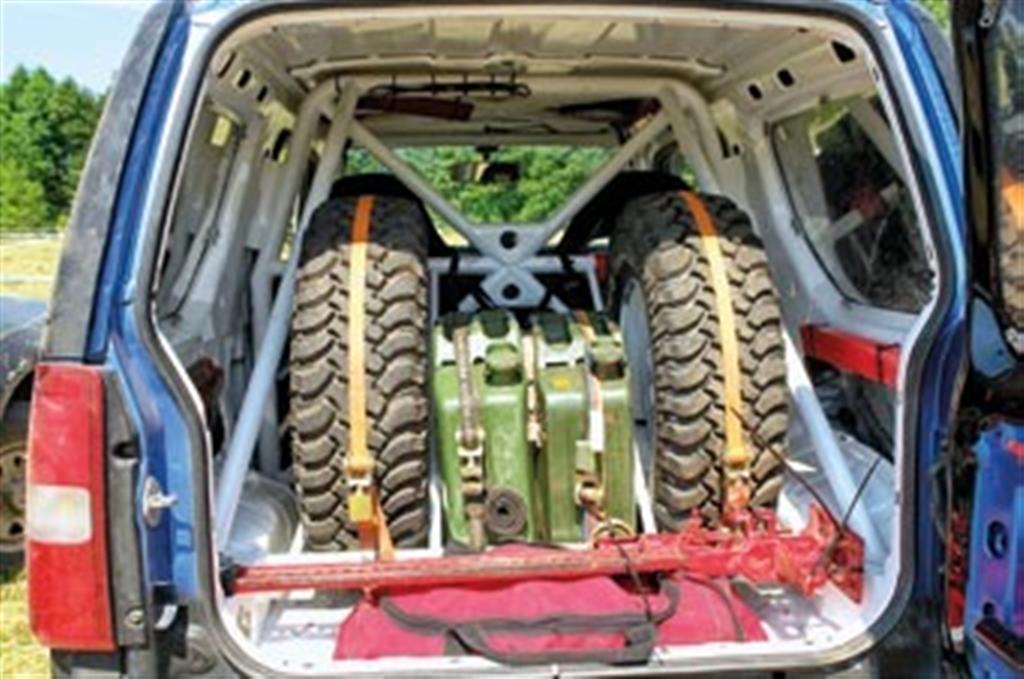 Konstruktorzy terenówek z wysokim podwoziem, niekoniecznie z oddzielną ramą, byli skazani na umieszczenie zapasu w bagażniku, jeśli brakło miejsca w ramie. Do wyboru były dwie lokalizacje – pod podłogą lub na bocznej ścianie. Ta pierwsza „miejscówka” powodowała nieuchronne podwyższenie poziomu podłogi. Plusem było jednak uzyskanie szerokiej i płaskiej powierzchni. Wybór bocznej ściany, zazwyczaj lewej, ułatwiał natomiast dostęp do zapasu, ale ograniczał widoczność do tyłu i zmniejszał szerokość przestrzeni bagażowej. Oba miejsca, ze względu na ograniczenia szerokości lub średnicy, nie pozwalały na zbytnie zwiększenie rozmiaru opony względem fabrycznego.